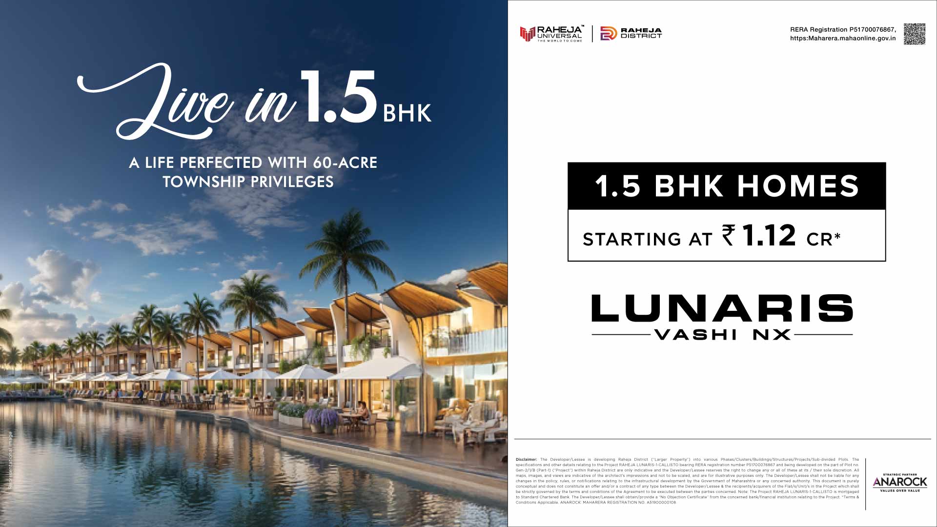 The Developer/Lessee is developing the Raheja District into various Phases/Clusters/Buildings/Structures/Projects/Sub Divided Plots. The specifications and other details of one of the Project being Raheja Lunaris-1- Callisto bearing RERA Registration P51700076867 (“Project”) shall be developed on the part of Plot no. Gen-2/1/B (Part-1) admeasuring about 7.912 acres (“said Property”) within the Raheja District, are only indicative and the Developer/Lessee reserves the right to change any or all of these at its / their sole discretion. All maps, images, and views are indicative of the architect’s impressions and not to be scaled and are for illustrative purposes only. The proposed infrastructure is presently proposed by the Government of Maharashtra and the Developer/Lessee shall not be liable for any change in the policy, rule, or notifications of the Government of Maharashtra as regards the same. This document is purely conceptual and does not constitute an offer and/or a contract of any type between the Developer/Lessee & the recipients and acquisition of the Flats/Units in the “Project” shall strictly be governed by the terms and conditions of the Agreement to be executed between the parties. Note: The “Project” is mortgaged to Standard Chartered bank. Raheja Universal (Pvt) Ltd. Shall obtain/provide a “No Objection Certificate”from Standard Chartered bank for the transfer of Flats/Unitsin the “Project”. *Terms & Conditions Applicable. ANAROCK: MAHARERA REGISTRATION NO. A51900000108